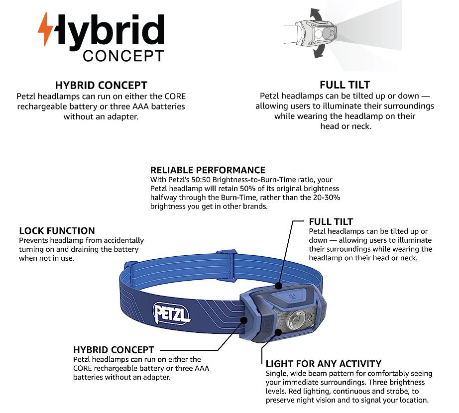 - HYBRID CONCEPT: Petzl headlamps can run on either the CORE rechargeable battery or three AAA batteries without an adapter.